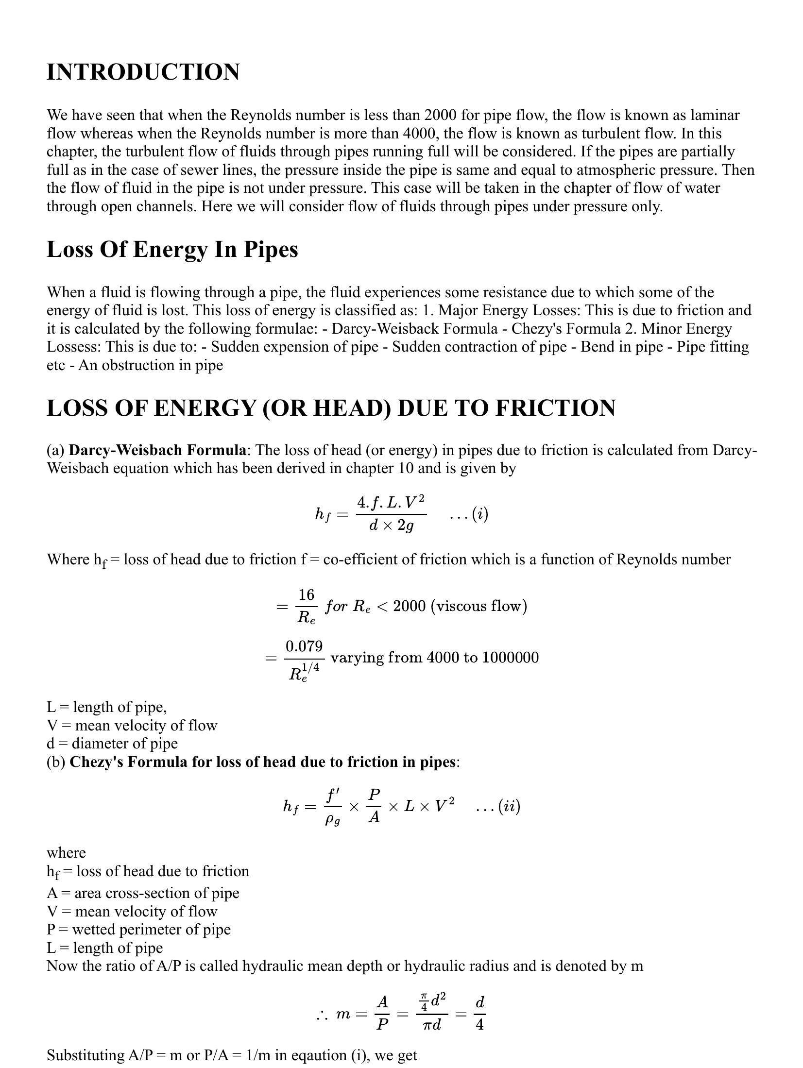Fluid Mechanics - Flow through Pipes